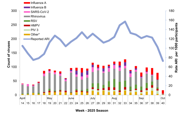 Figure 1 Weekly ILI and virus positive cases among WellKiwis participants since 31 March 2025